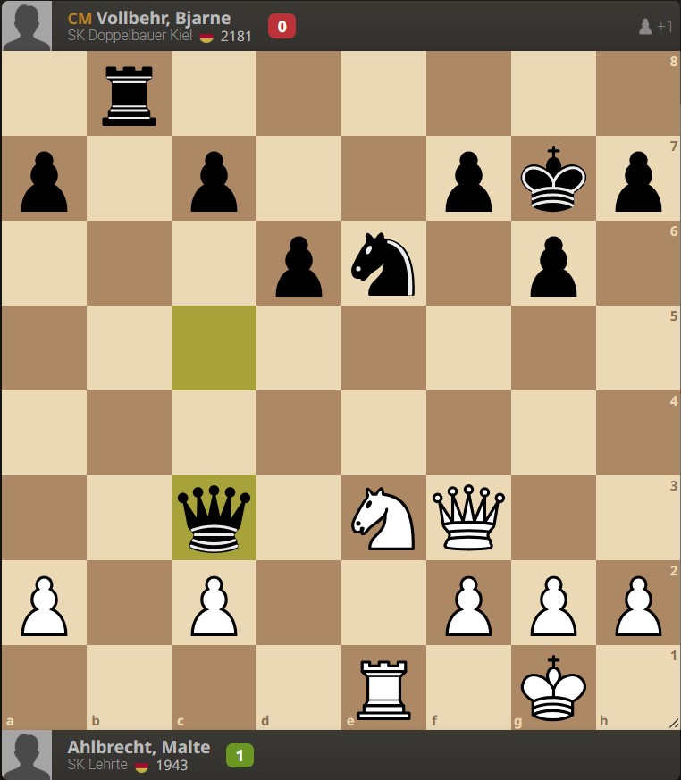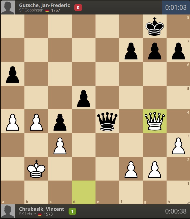 An Brett 1 hatte Jannik nie Probleme, kämpfte zwischenzeitlich sogar um mehr, und sicherte sich mit einem Dauerschach ein Remis gegen IM Magnus Ermitsch. Moritz kämpfte an Brett 4 um ein Remis, wie das Turmendspiel schlussendlich ausgegangen ist war klar :) Leon verlor leider, ebenso wie Konrad der bis zum Ende noch den ganzen Punkt zum greifen nah hatte. Malte hatte zwar lange Zeit einen Bauern weniger, konnte aber in der folgenden Stellung hübsch gewinnen. Somit der Endstand, ein starkes 3:3.